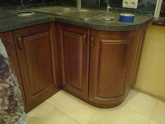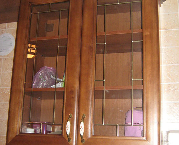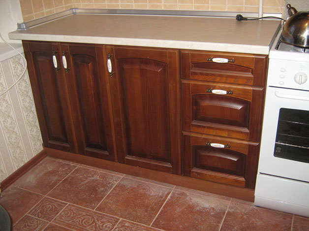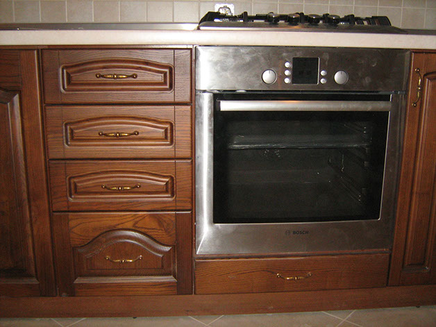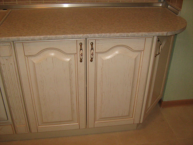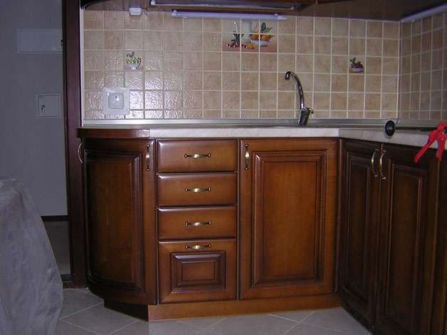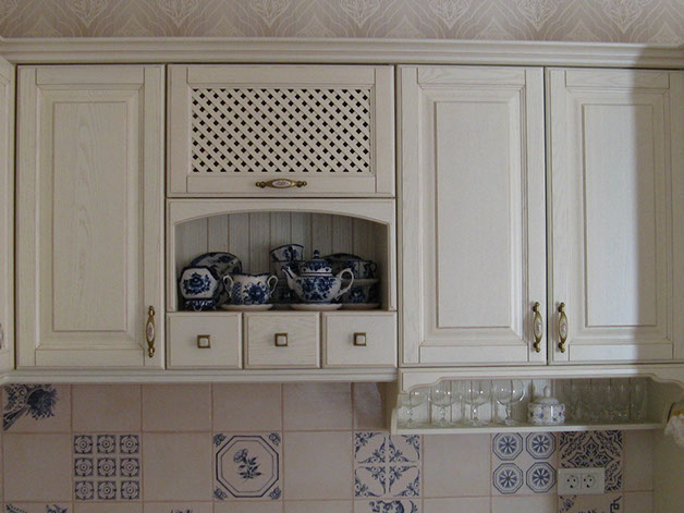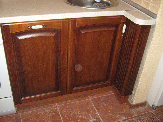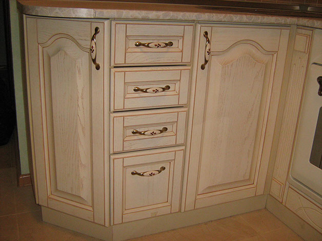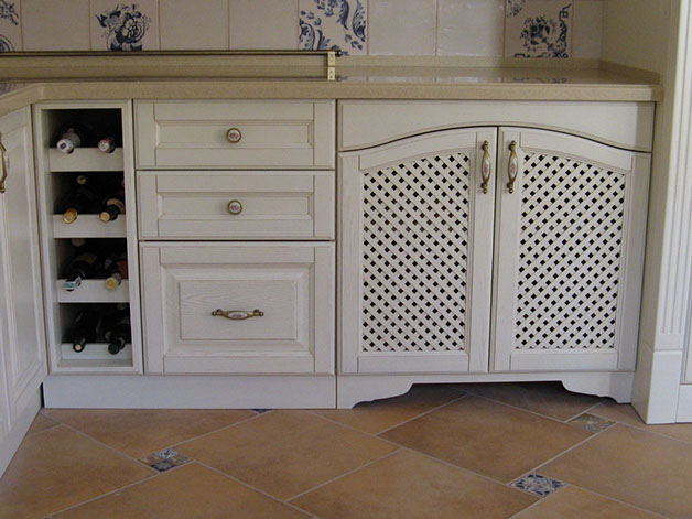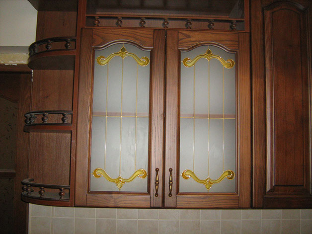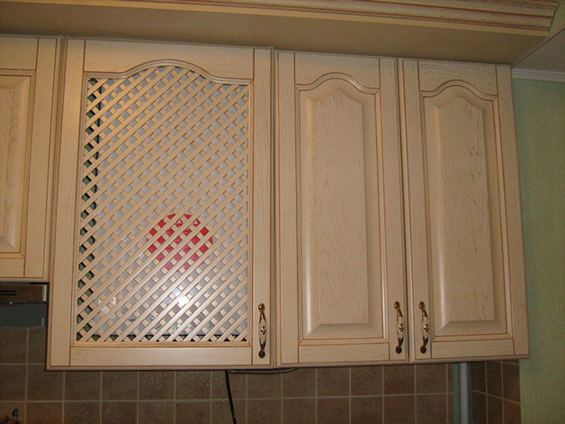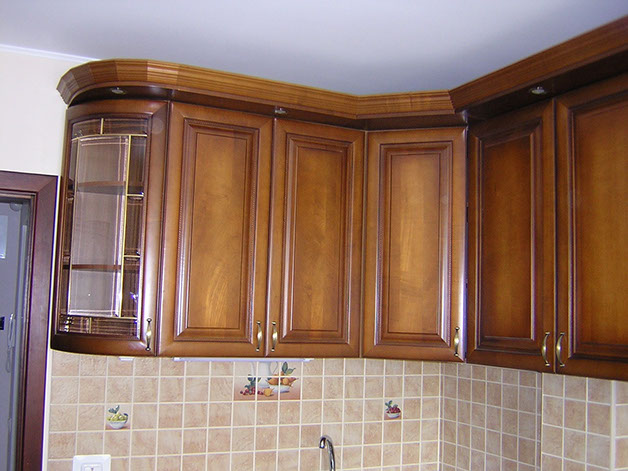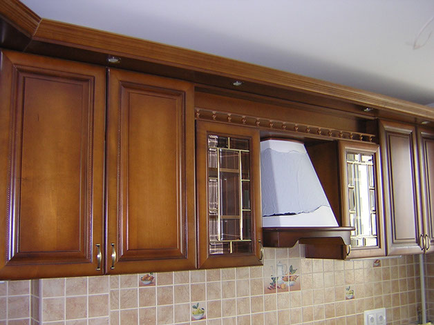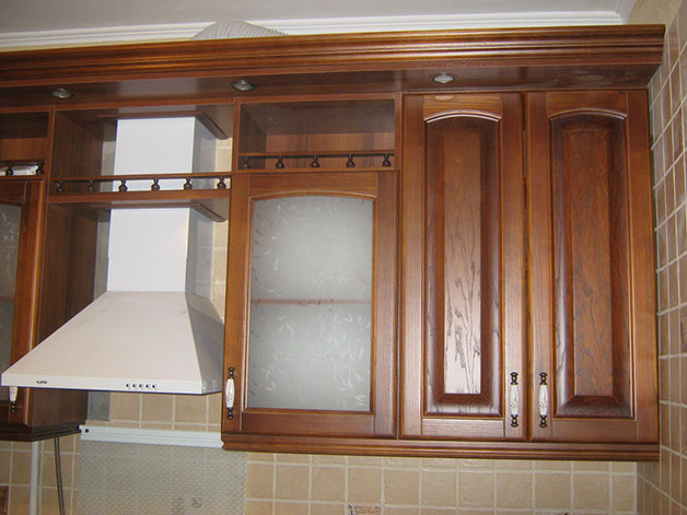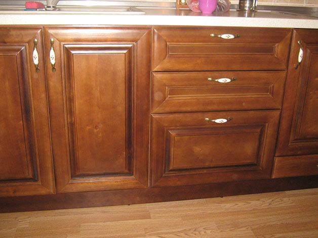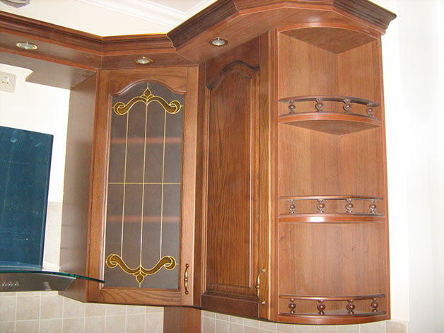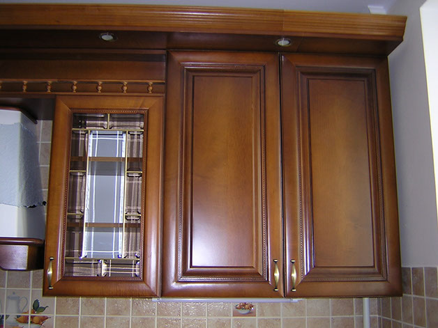 Фасады из натурального дерева обычно дополняются разнообразными аксессуарами (карнизами, балясинами). Филенки деревянных дверок зачастую делаются фигурными, полотно украшается резьбой, а иногда и рельефными декоративными элементами, что подчеркивает традиционный дух классического стиля.