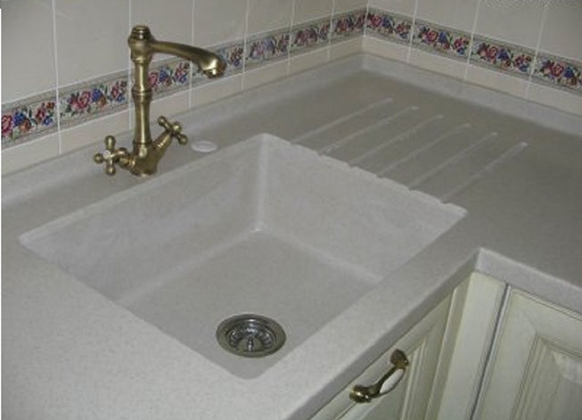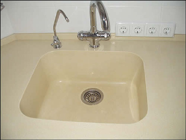 Последняя тенденция в мире «мойка для кухни» - это раковины, изготовленные из искусственного камня. Такая мойка изготавливается из того же камня, что и столешница. Затем она подклеивается с внутренней стороны каменной столешницы. Стык полируют и внешний вид столешницы и мойки приобретает цельный вид. В таком варианте раковины из искусственного камня есть много неоспоримых преимуществ. Во-первых, столешницы имойки из искусственного камня не боятся воды и загрязнений. Во-вторых, отсутствует щель между мойкой и столешницей, куда регулярно забивается грязь, крошки, остатки еды и так далее. В-третьих, очень удобно сметать остатки воды, влаги, крошки с каменной столешницы прямо в мойки из искусственного камня. Современные хозяйки, испытывая в деле такой вариант приготовления и уборки на кухне, приходят в неописуемый восторг. Ведь раньше, при использовании накладных раковин, приходилось аккуратно обметать пространство вокруг чаши, затем собирать все остатки в руку, и только затем выбрасывать их в мойку.